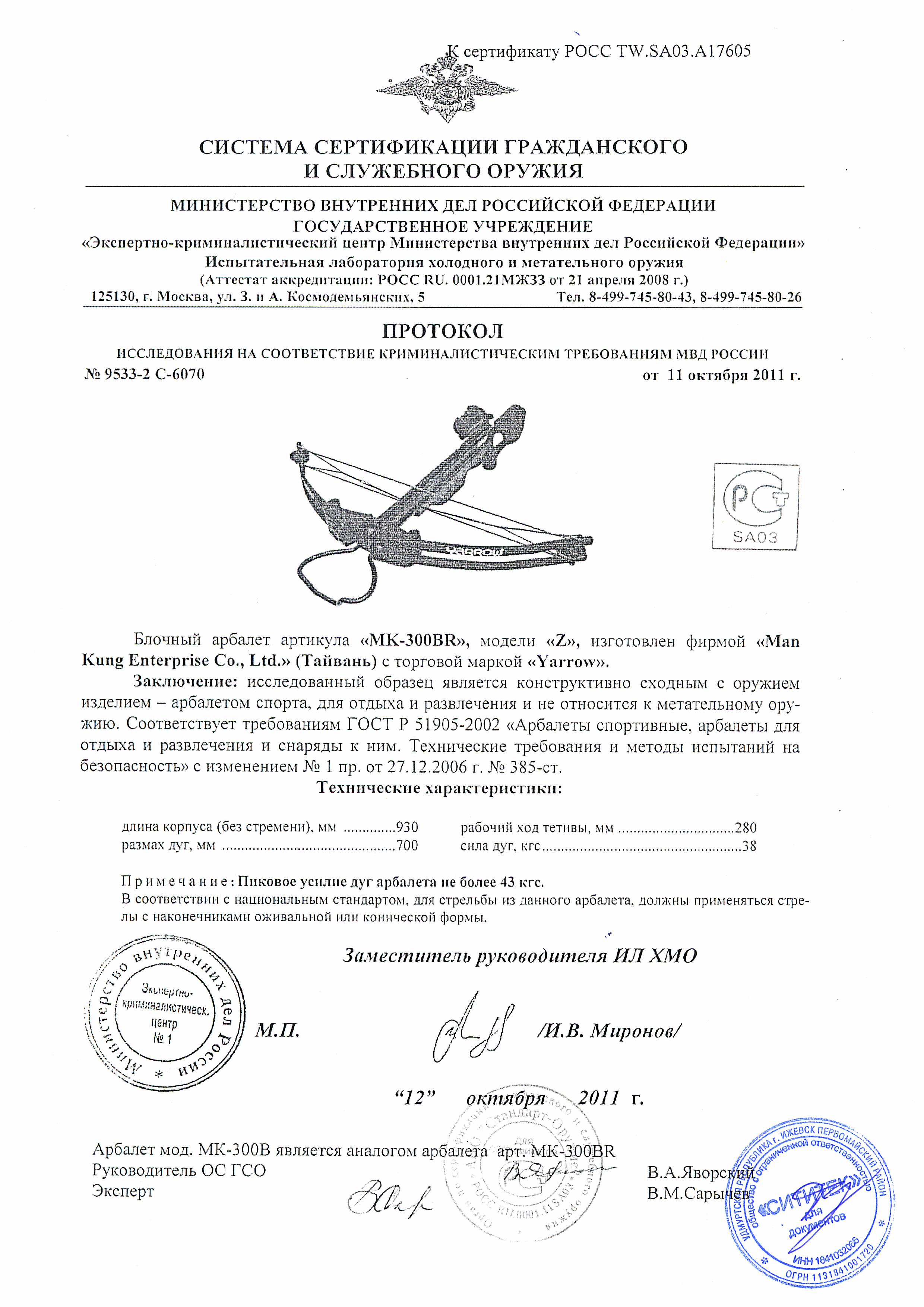 - длина арбалета (со стременем) — 927 мм (36,5");