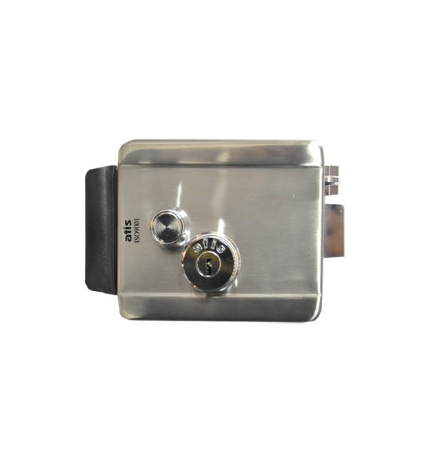 Электромеханический замок, цилиндровый запирающий механизм, накладной, установка наружная/внутренняя, левая/правая, нержавейка, кнопка выхода на замке, перфорированных (лазерных) ключей 5 шт. в комплекте, 12В/2А.